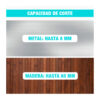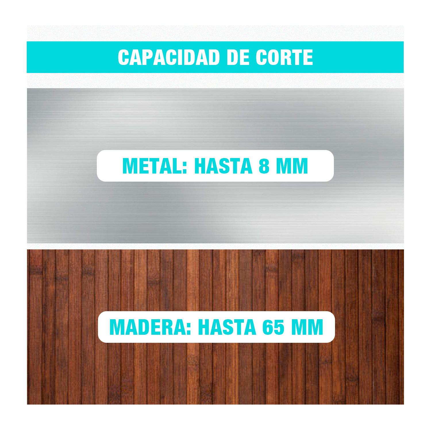 - Capacidad de Corte: 8mm (Metal) 65mm (Madera)