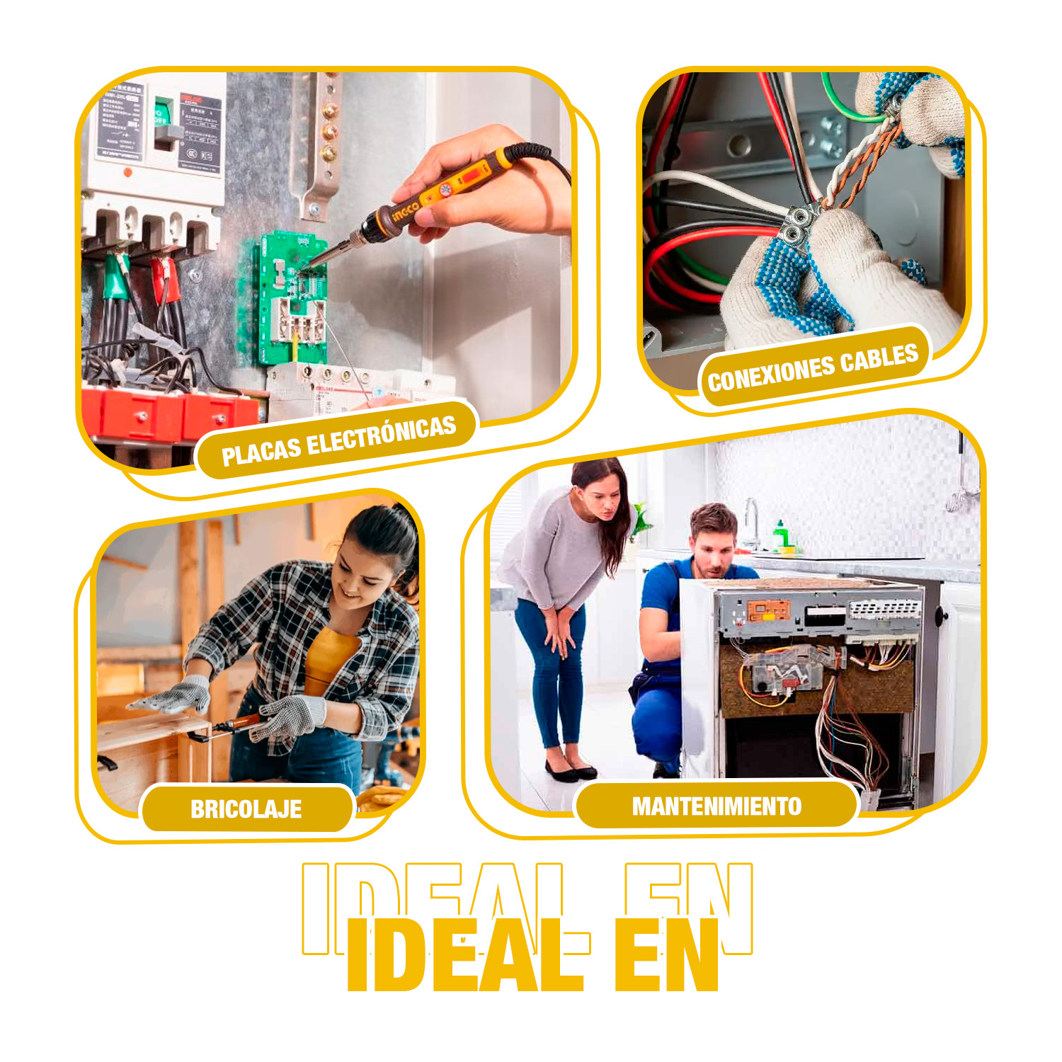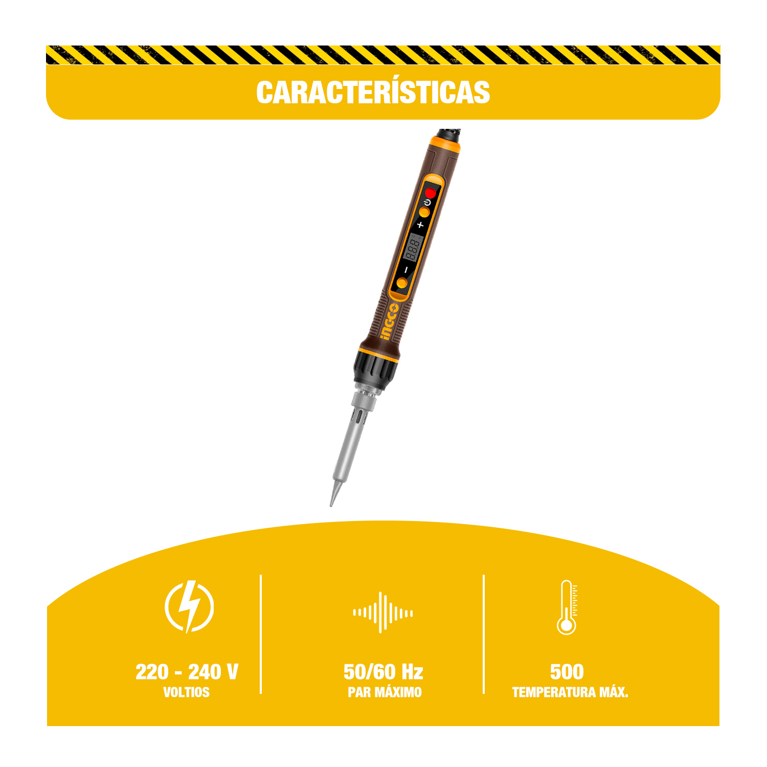Soldador eléctrico potente y de calentamiento rápido, con temperatura ajustable para mayor control y precisión. Su diseño cómodo tipo lápiz y su punta reemplazable garantizan soldaduras firmes y un uso confiable tanto en trabajos profesionales como domésticos.