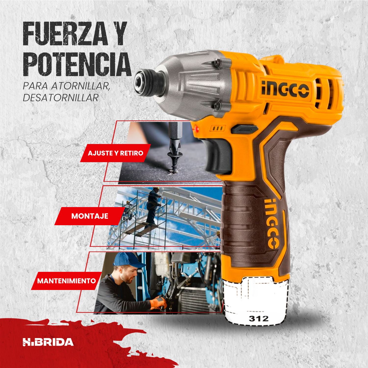El INGCO CIRLI1201 es un atornillador de impacto inalámbrico de 12V que destaca por su diseño compacto y una fuerza de torque de 100 Nm, ideal para fijar tornillos con rapidez en madera o metal sin esfuerzo manual. Pertenece a la línea S12, cuenta con un mandril hexagonal de 1/4", luz LED integrada para zonas oscuras y un gatillo de velocidad variable que alcanza las 2000 RPM. Generalmente se vende en un kit que incluye dos baterías de 1.5Ah, cargador y maletín, posicionándose como una herramienta eficiente y ergonómica para proyectos de ensamblaje y mantenimiento.