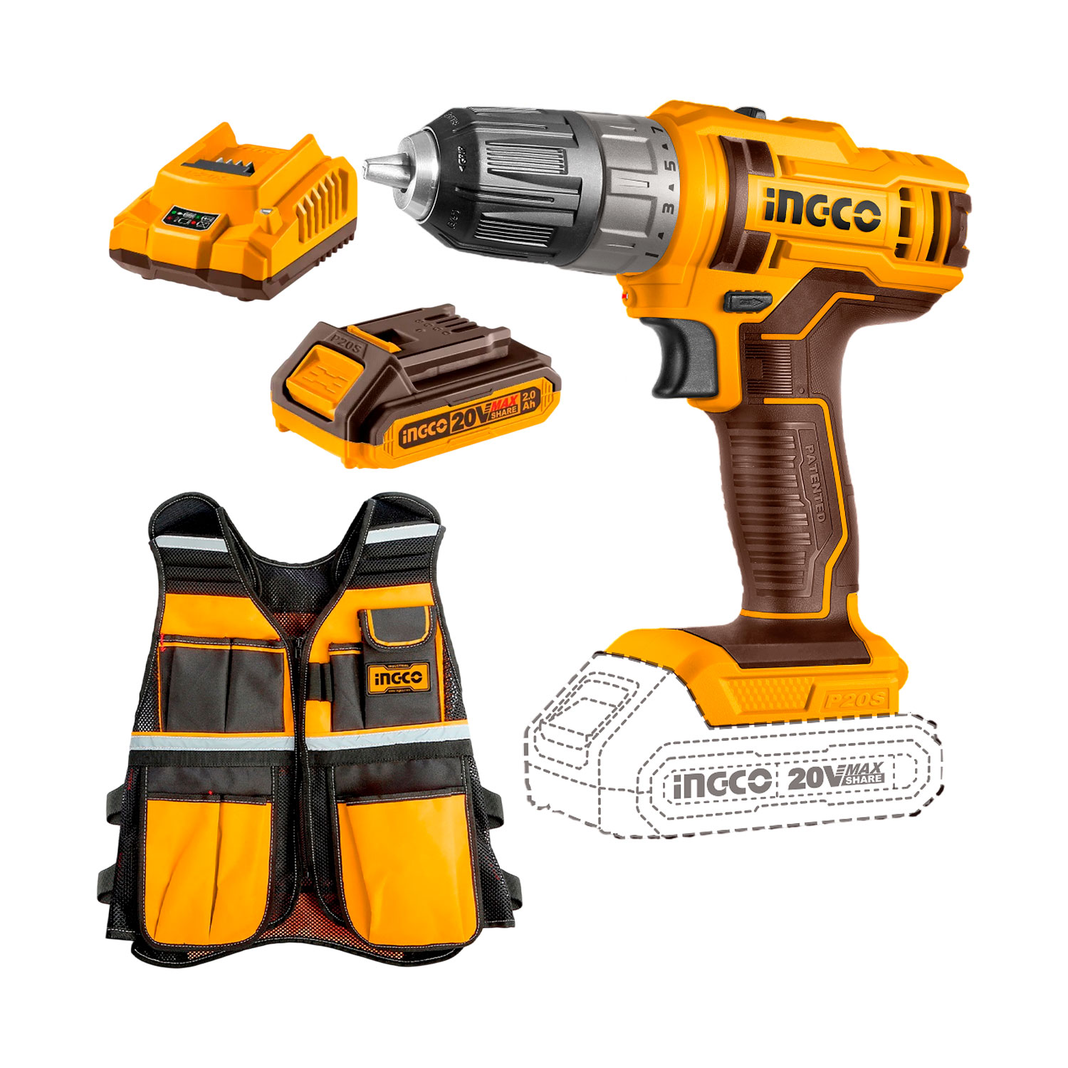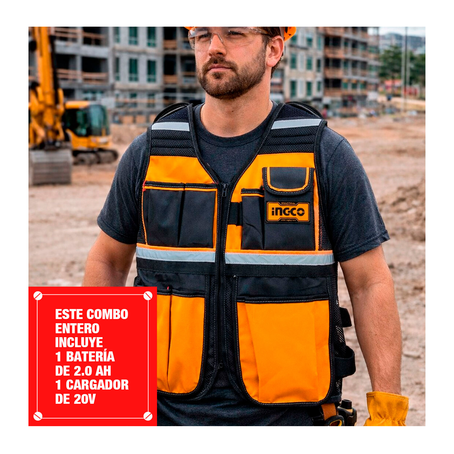 ESTE COMBO INCLUYE: 1 TALADRO ATORNILLADOR + CHALECO PORTAHERRAMIENTAS + 1 BATERÍA 2.0AH + 1 CARGADOR