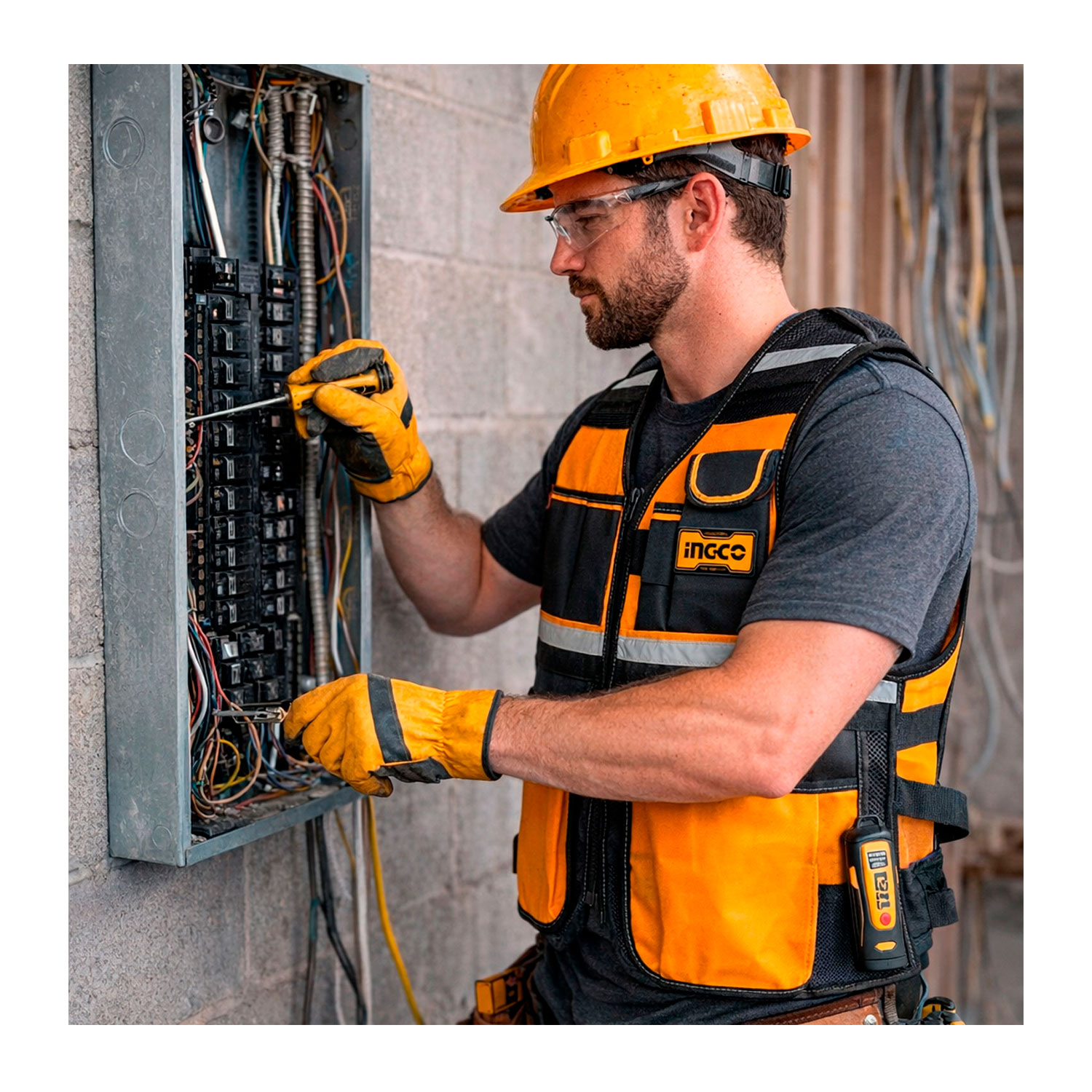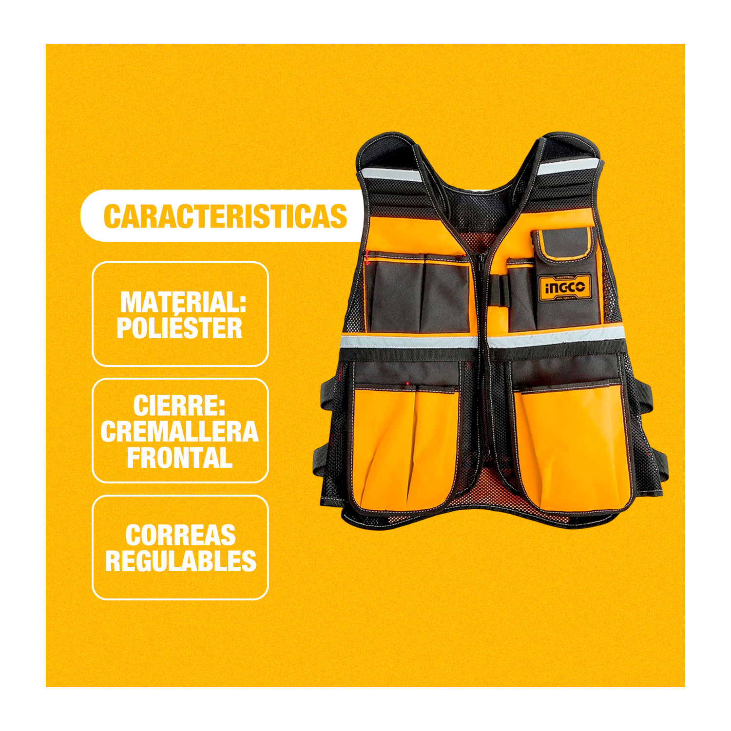 El INGCO HTVT0901 es un chaleco porta herramientas multiuso diseñado para mantener tus herramientas organizadas y siempre a mano mientras trabajas; está fabricado en poliéster resistente con malla de aire transpirable, cuenta con 7 bolsillos y múltiples compartimentos, correas ajustables en hombros y cintura para mayor comodidad y puede soportar hasta 3 kg de herramientas, lo que lo hace ideal para técnicos, carpinteros, electricistas y aficionados del bricolaje que necesitan accesibilidad y eficiencia en sus tareas