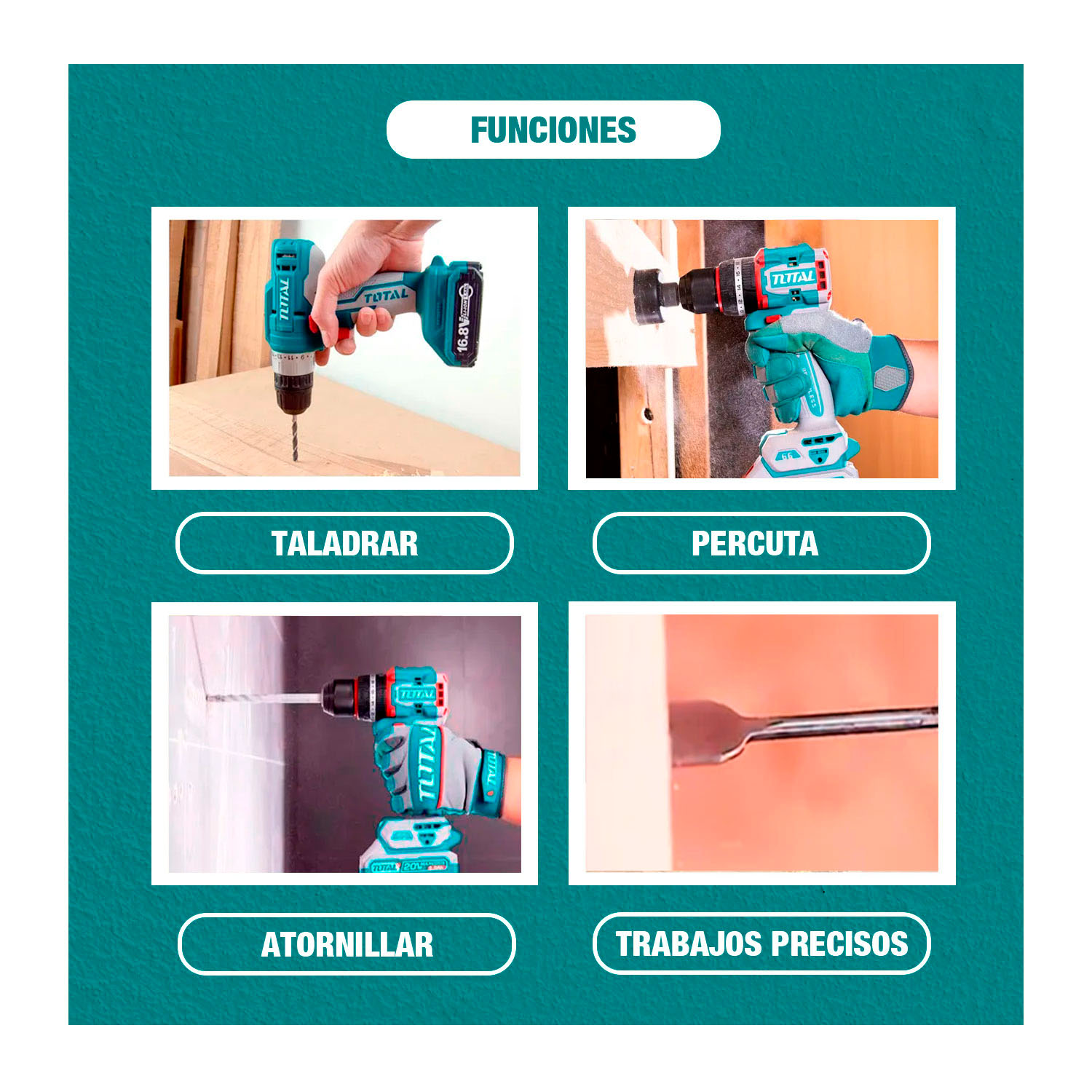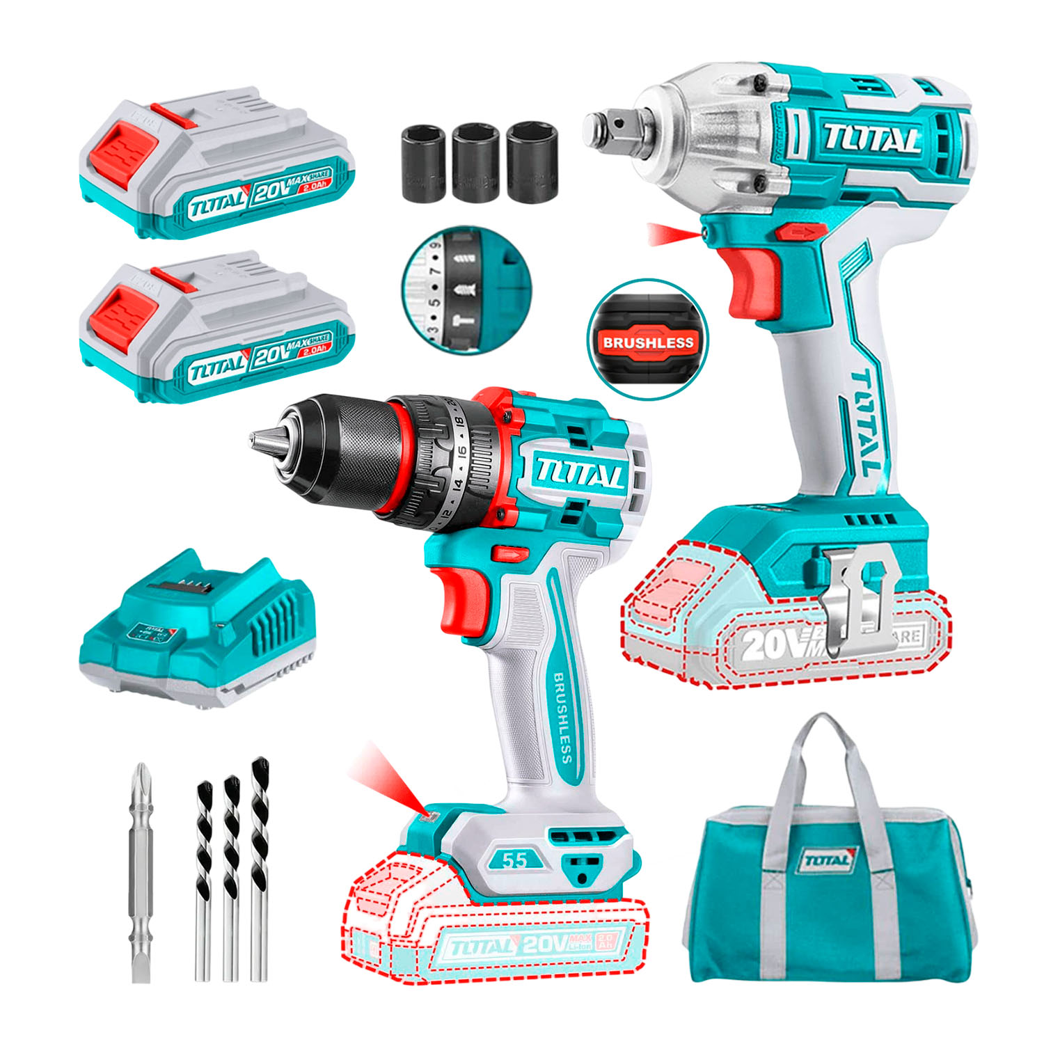 Taladro Atornillador 55Nm Brushless+ Llave de Impacto 1/2» 300Nm con Bat./Carg TOTAL