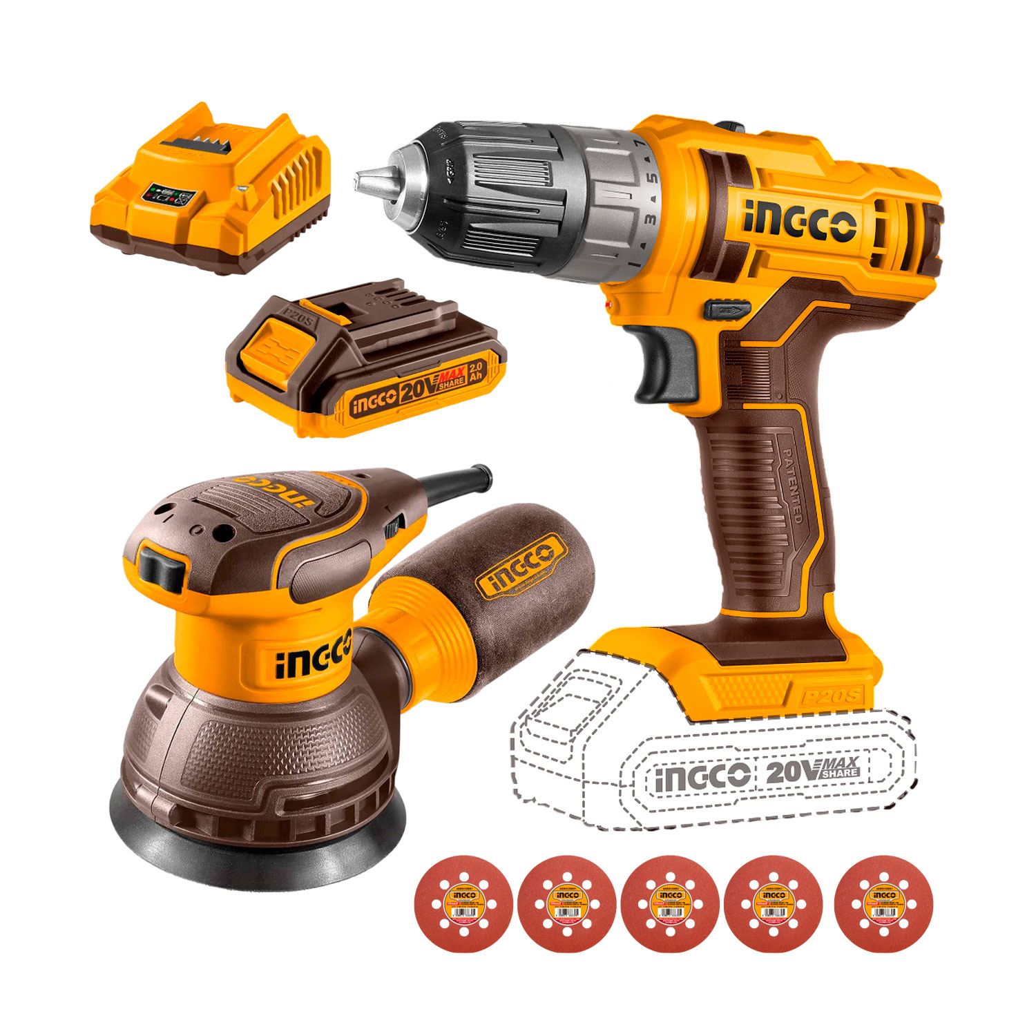Taladro Atornillador Ingco 20v + Lijadora Roto Orbital 320w + 1 Batería 2.0ah + 1 Cargador