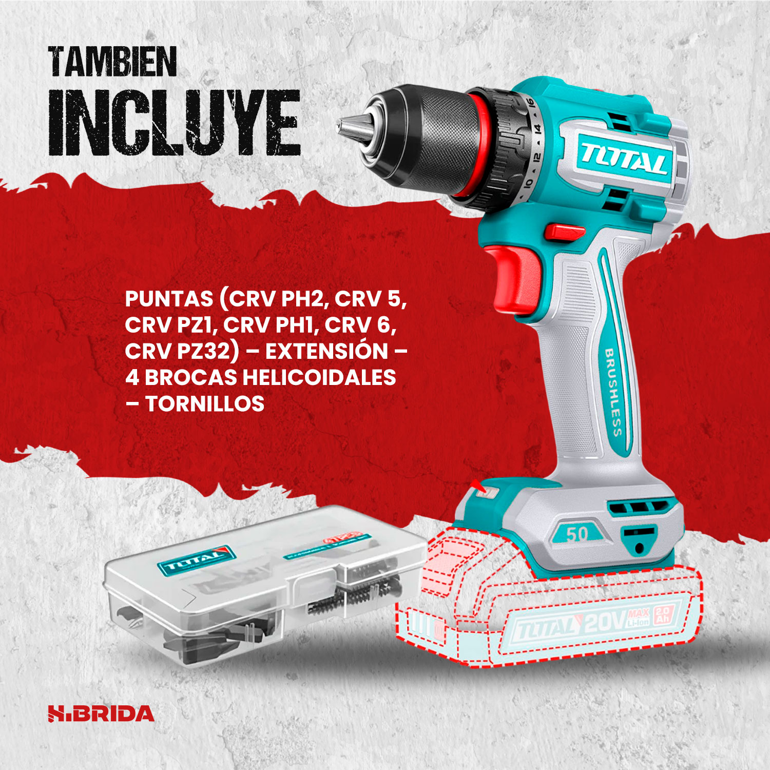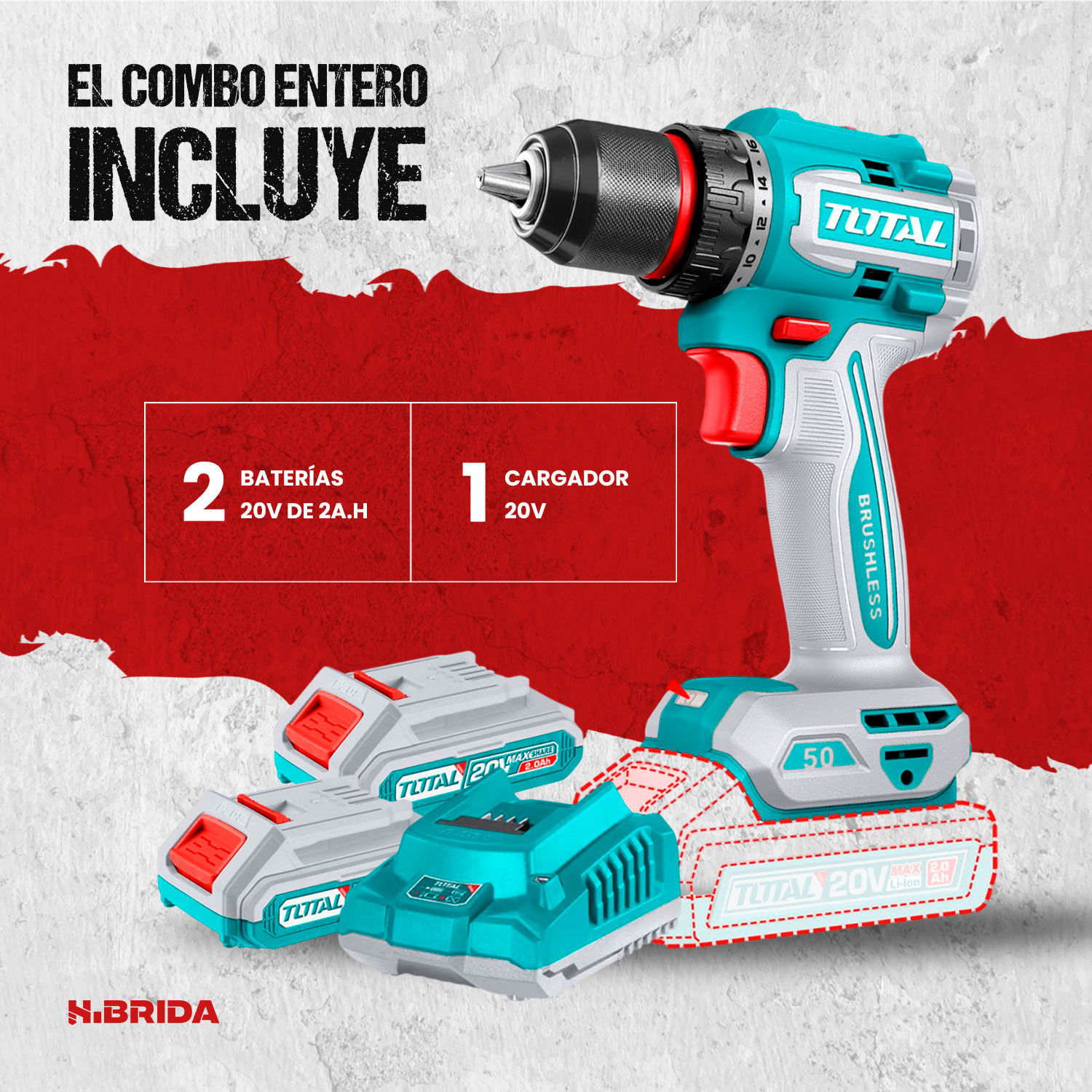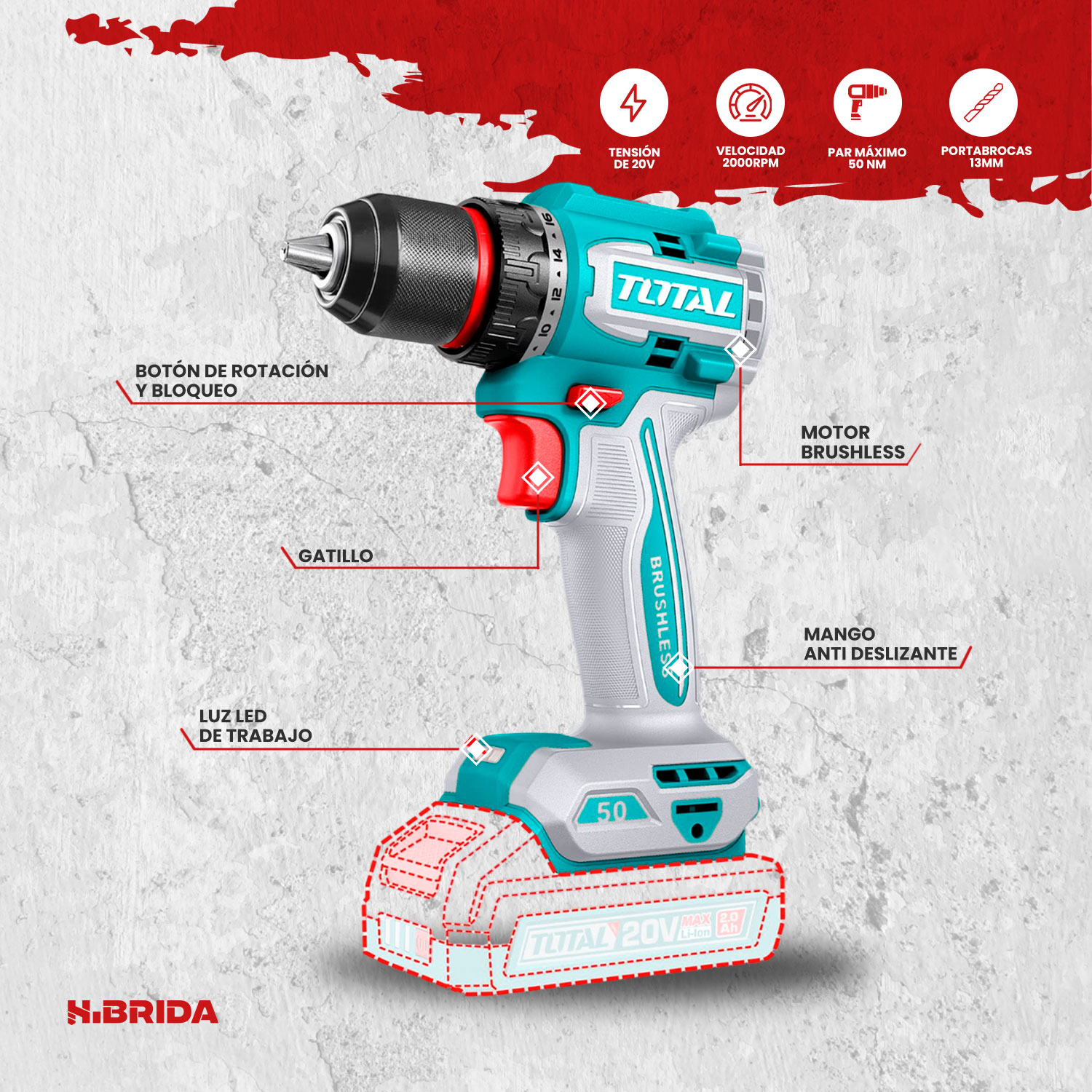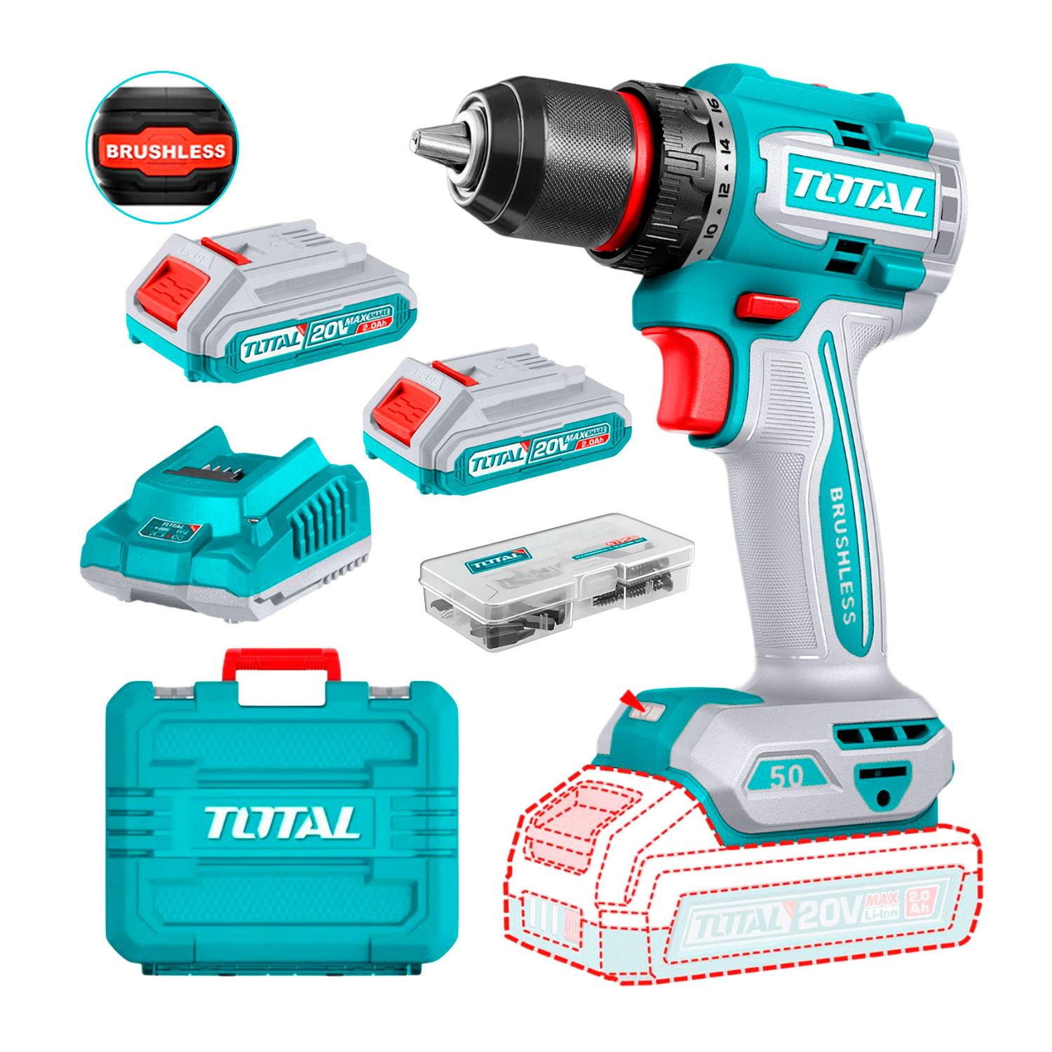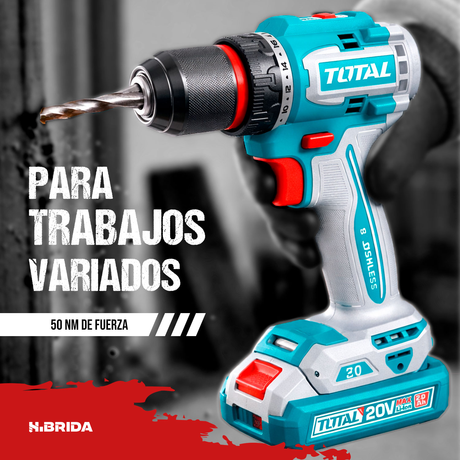 El TDLI205062 de TOTAL Tools es un taladro/atornillador inalámbrico de 20V diseñado para ofrecer potencia, eficiencia y comodidad en trabajos profesionales y domésticos. Equipado con motor brushless (sin escobillas), proporciona mayor durabilidad, mejor rendimiento y menor calentamiento, alcanzando un torque máximo de 50 N·m ideal para perforaciones en madera y metal, así como tareas de atornillado exigentes. Cuenta con 2 velocidades mecánicas (0–500 / 0–2000 rpm), portabrocas metálico de 13 mm con ajuste rápido y función de bloqueo de husillo para cambios ágiles de broca. Incluye 2 baterías de 2.0Ah compatibles con la plataforma P20S, cargador y maletín, convirtiéndolo en una herramienta versátil, compacta y lista para el trabajo continuo.