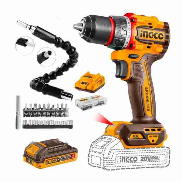 TALADRO INALÁMBRICO 55NM INGCO 20V BRUSHLESS+ EXTENSOR FLEXIBLE 21ACCS