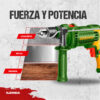 Taladro percutor de 650W diseñado para ofrecer potencia y precisión en cada trabajo. Su velocidad variable y función reversible lo convierten en una herramienta versátil para perforar madera, metal y concreto ligero. Incluye mango auxiliar para mayor control, ideal tanto para uso doméstico como profesional.