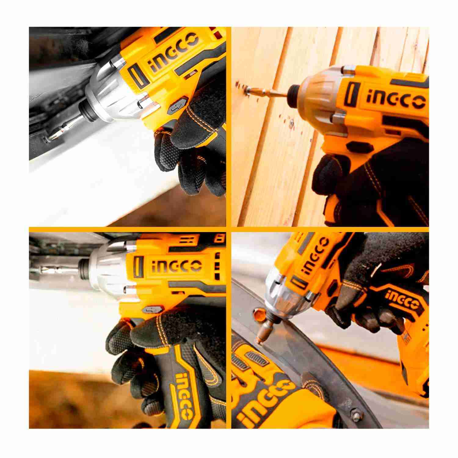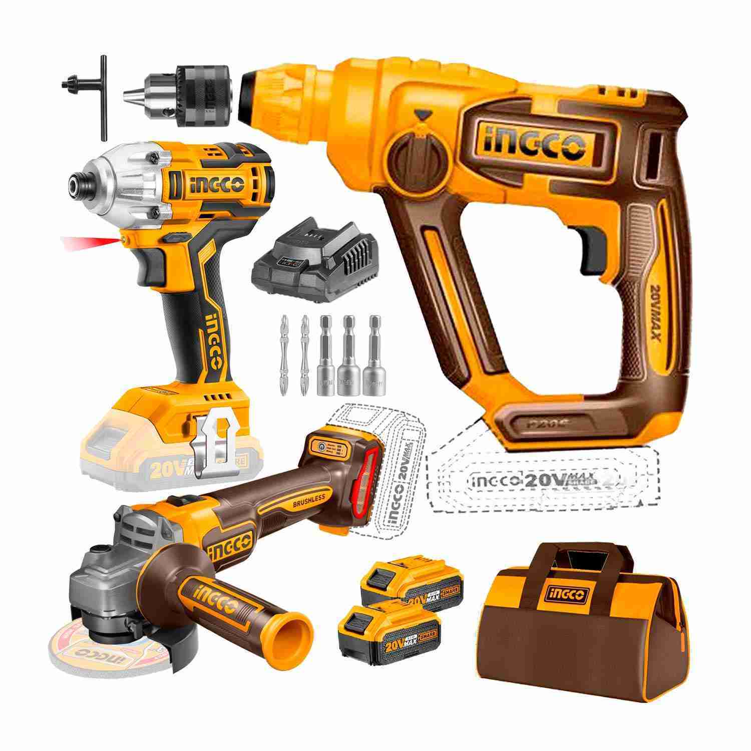• SET DE HERRAMIENTAS INGCO AMOLADORA-ROTOMARTILLO-ATORNILLADOR DE IMPACTO-ADAPTADOR •
